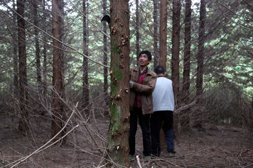 10月3日,虽是国庆长假,但高岩子林场仍是忙忙碌碌,几名工人在密不透风的日本花柏林里,进行剔枝抚育,一个上午的功夫,10多亩林子里的枯死枝、病弱树及杂灌全部清理干净,原来不透一丝光亮的树林豁然变得通风、透光。